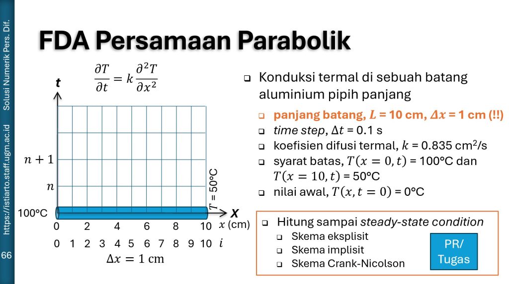 Source code di bawah ini menyelesaikan persamaan difusi 1D yang diaplikasikan dalam penjalaran (transpor, transfer) termal di sebuah batang baja. Lihat bahan ajar mata kuliah Solusi Numerik Persamaan Diferensial. Program dituliskan dalam bahasa pemrograman Python. Program dibuat sederhana agar mudah dibaca dan dimodifikasi oleh pengguna.