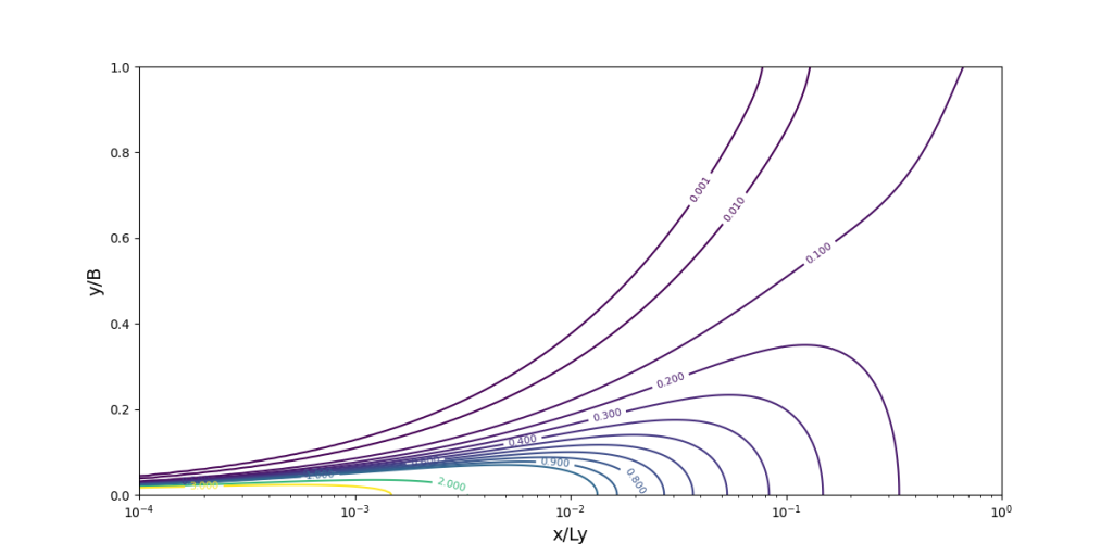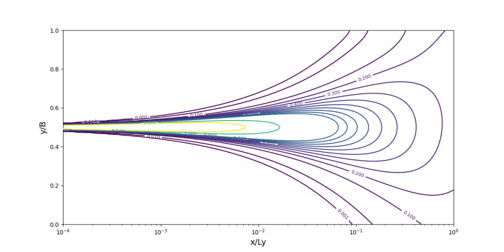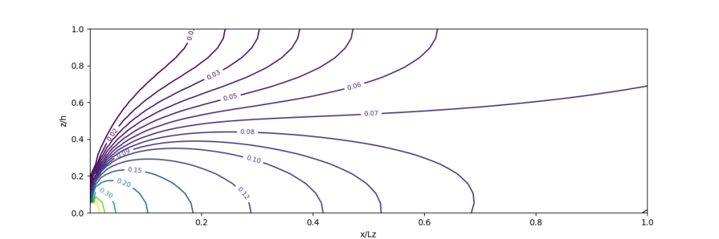 Source code di bawah ini memplotkan kontur konsentrasi polutan yang diperoleh dari penyelesaian analitik persamaan transpor konveksi-difusi di sungai. Lihat bahan ajar mata kuliah Dinamika Aliran dan Transfer Massa. Program dituliskan dalam bahasa pemrograman Python. Program dibuat sederhana agar mudah dibaca dan dimodifikasi oleh pengguna.